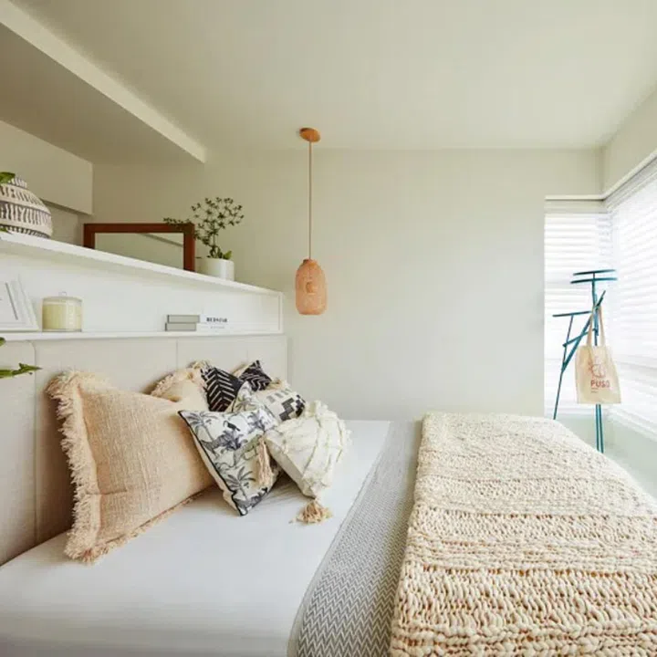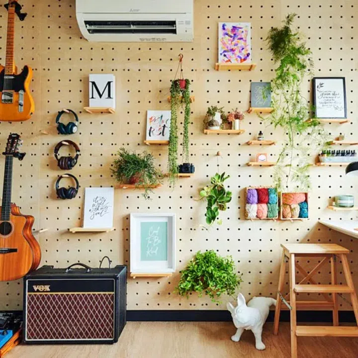 The remaining two rooms are the guest room and the study, which husband and wife share. In pride of place is a full-length pegboard wall which showcases the couple’s interests, with Natalie’s handicrafts taking up one side and Christopher’s audio equipment on the other. “This pegboard lets them move things around and set up shelves as they need,” explains Chris. “It really lets them express their creativity.”