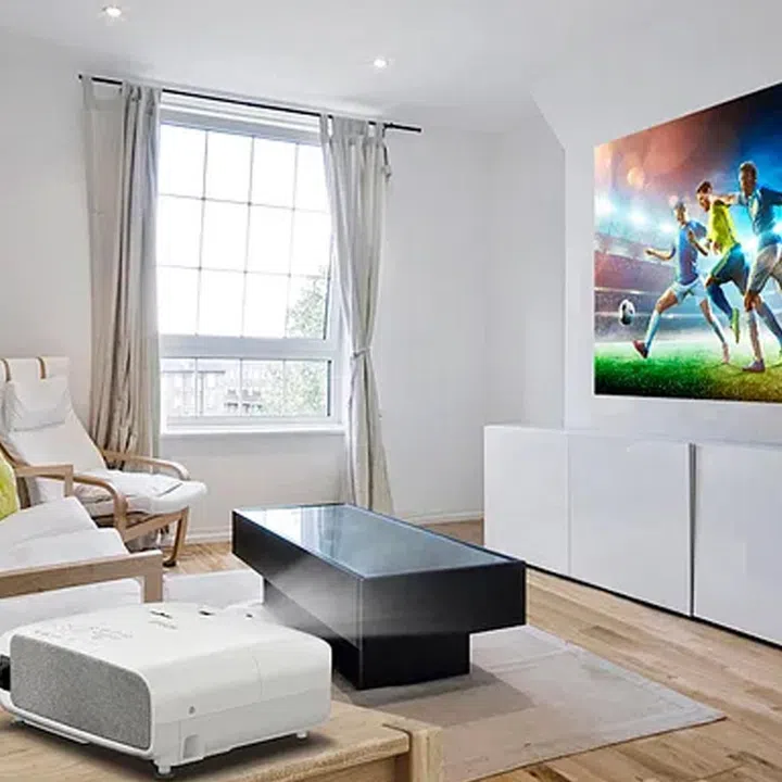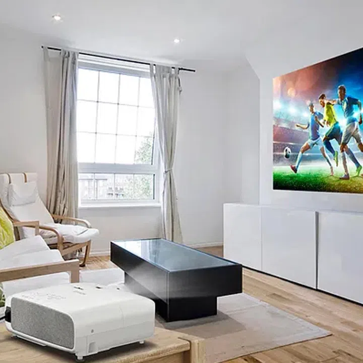 An Ultra Short Throw (UST) projector is ideal for movie nights in a limited space. These devices generally have a very wide-angle lens with a throw ratio of less than 0.4m, letting you place the projector just under or just above the screen, which means it’s easy to install and saves the cost and hassle of a ceiling-mounted one.