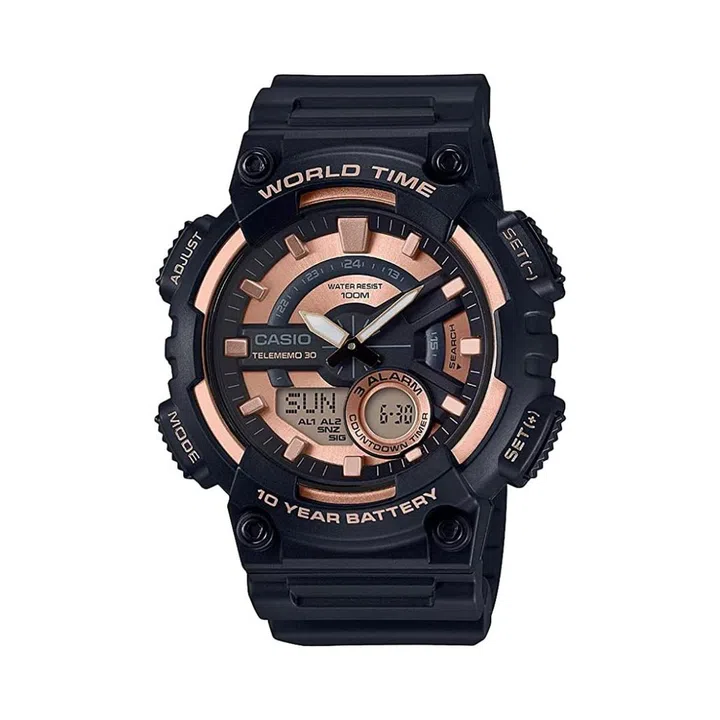 The Telemomo watch can tell the time in 48 cities in 31 time zones and is water resistant. The stylish copper colour accents also help with the visual appeal.