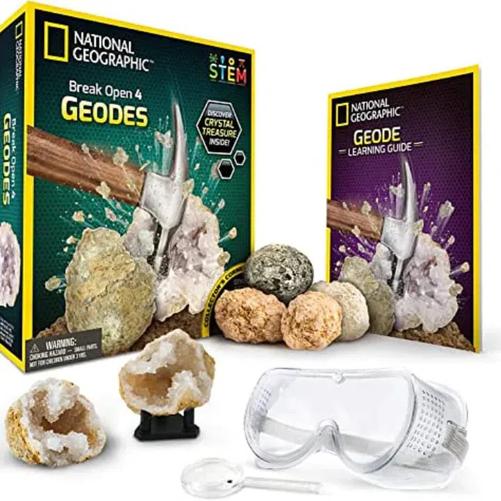 NATIONAL GEOGRAPHIC Break Open 4 Geodes Science Kit – Includes Goggles, Detailed Learning Guide and Display Stand