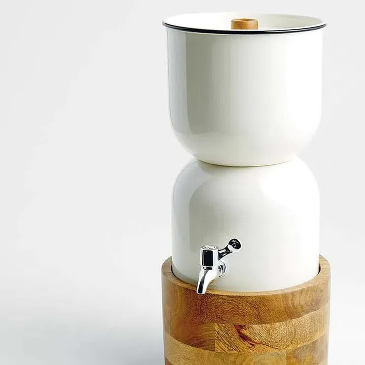 Serve up your drinks in style with this stylish enamel drink dispenser, perched atop a stand of hand-cut mango wood. Its stainless steel spigot lets your guests serve themselves easily – and you won’t even have to top up very often, thanks to its capacity of 6.5 litres.