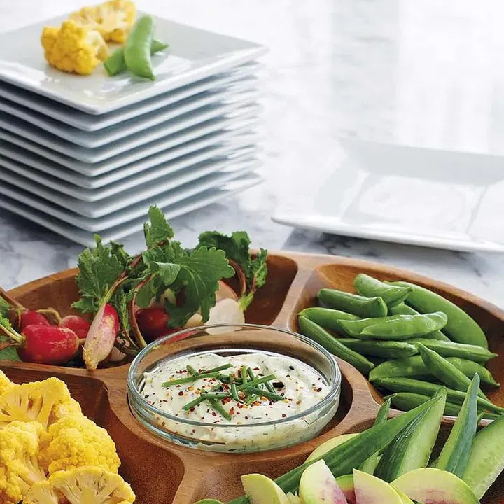 Made from albizia wood, this five-part server is perfect for a grazing situation. There are four segments for snacks and candy, with a dip well in the centre for sauces. You can also use it to serve up garnishes at a do-it-yourself cocktail station.