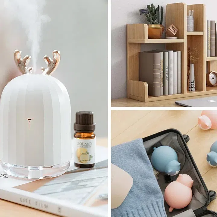 We found a wooden shelf ($21) that will help you keep all your small items in order, succulent planters ($10) for your desk plants that are great for career Feng Shui, cat-themed water thermal water bottle that’s also microwaveable, electric aromatherapy diffuser ($14), and small desk mirrors ($12).