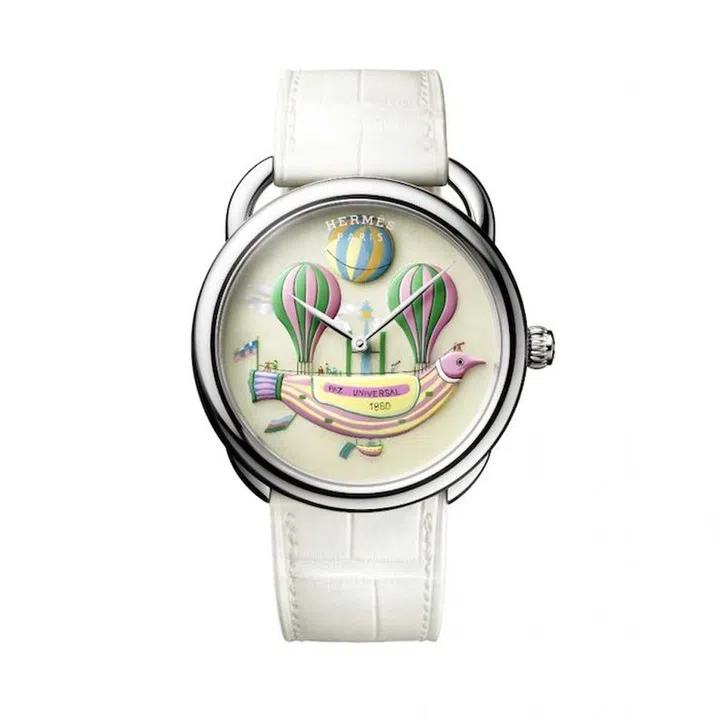 The timepiece is inspired by the playful Les folies du ciel scarf created by famous Hermes artist Loic Dubigeon in 1984, and a homage to the early days of aviation when men dreamt of conquering the skies with airships and hot-air balloons.