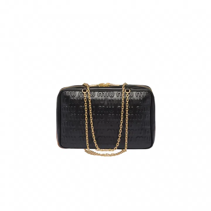 Meet Miu Miu’s answer to the logo-festooned bag: a boxy shoulder bag plastered with an all-over embossed Miu Miu pattern. Besides black, this debut style also comes in shades of nude and pink – perfect pieces to completement the brand’s flirty micro mini skirts ensembles.