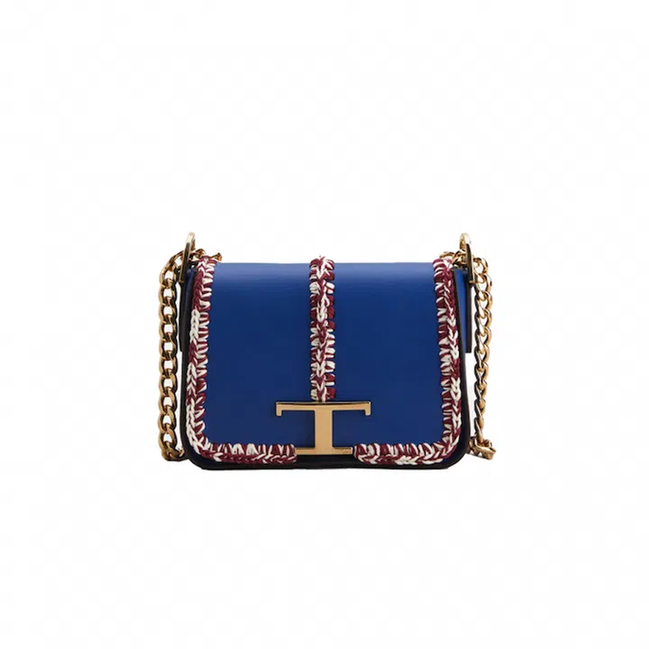 Tod’s continues to build on its T Timeless collection this season. The line, marked by a T-shaped logo, includes more creative expressions now including this gem-hued version featuring multi-coloured braided detail on the trimming.