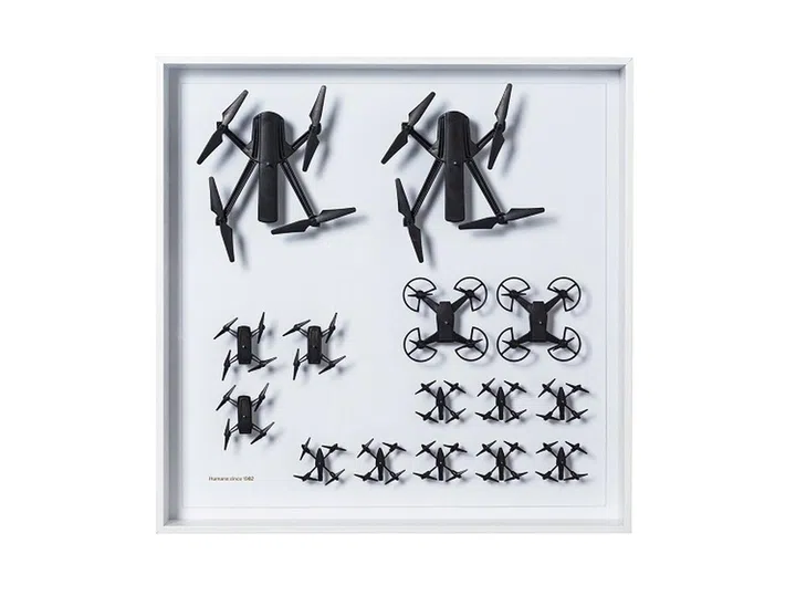 The creative duo of Humans Since 1982 often take iconic objects and recognisable signs and symbols out of their usual habitats and place them into new environments. Case in point: The drone, which is a present-day technological item, now rendered static as though it is a timeless artefact or specimen.