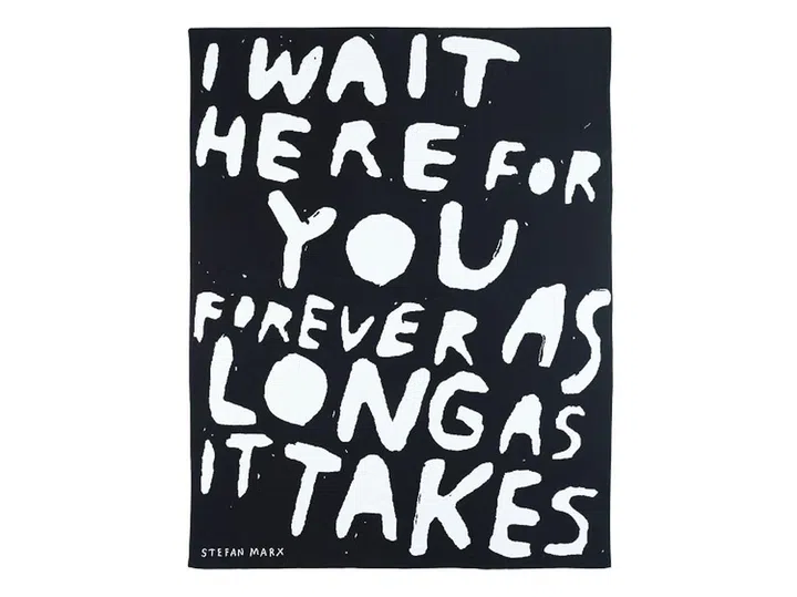 The phrase “I wait here for your forever as long as it takes” is emblazoned across this throw, originally scribbled in Marx's notebook after seeing the message graffitied onto a wall in London.