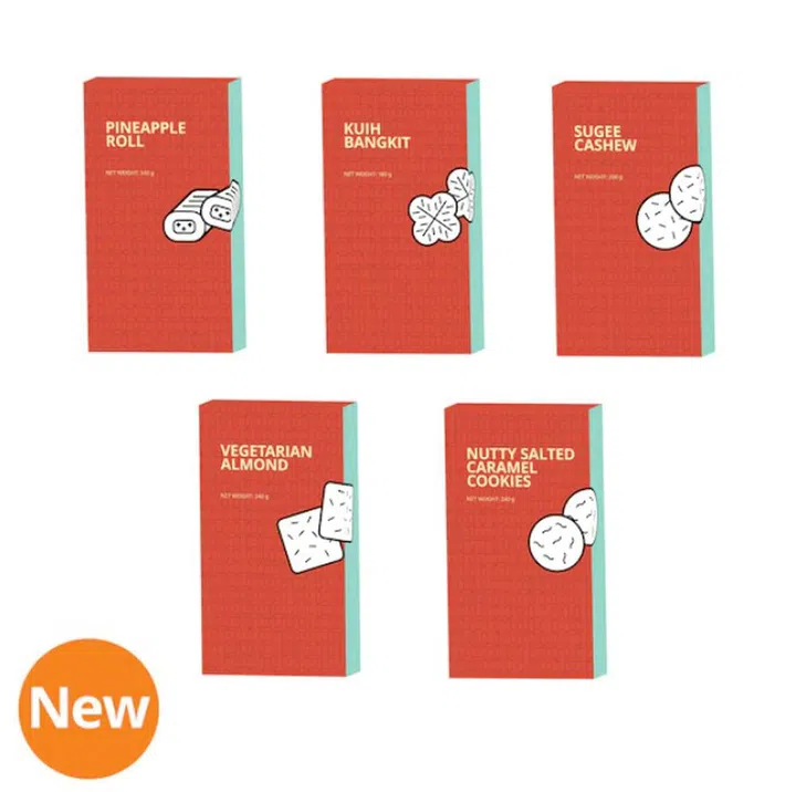 Pineapple roll, Kuih Bangkit, Sugee Cashew, Vegetarian Almond, and Nutty salted caramel cookies, $6.80 to $7.80