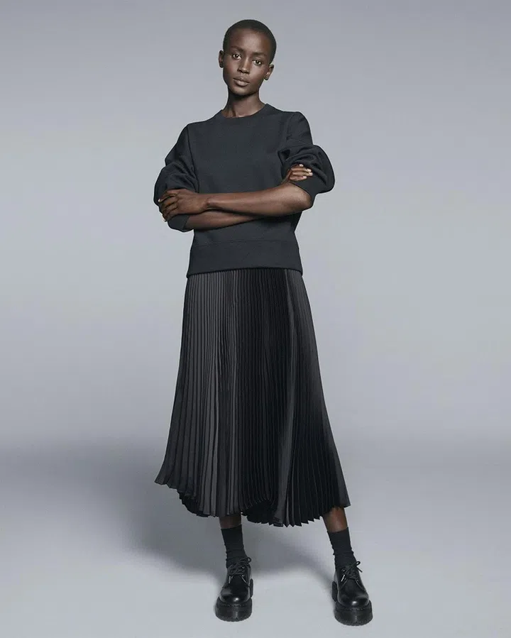 Dry cropped long sleeve sweatshirt, $59.90, and long pleated skirt, $129.90.