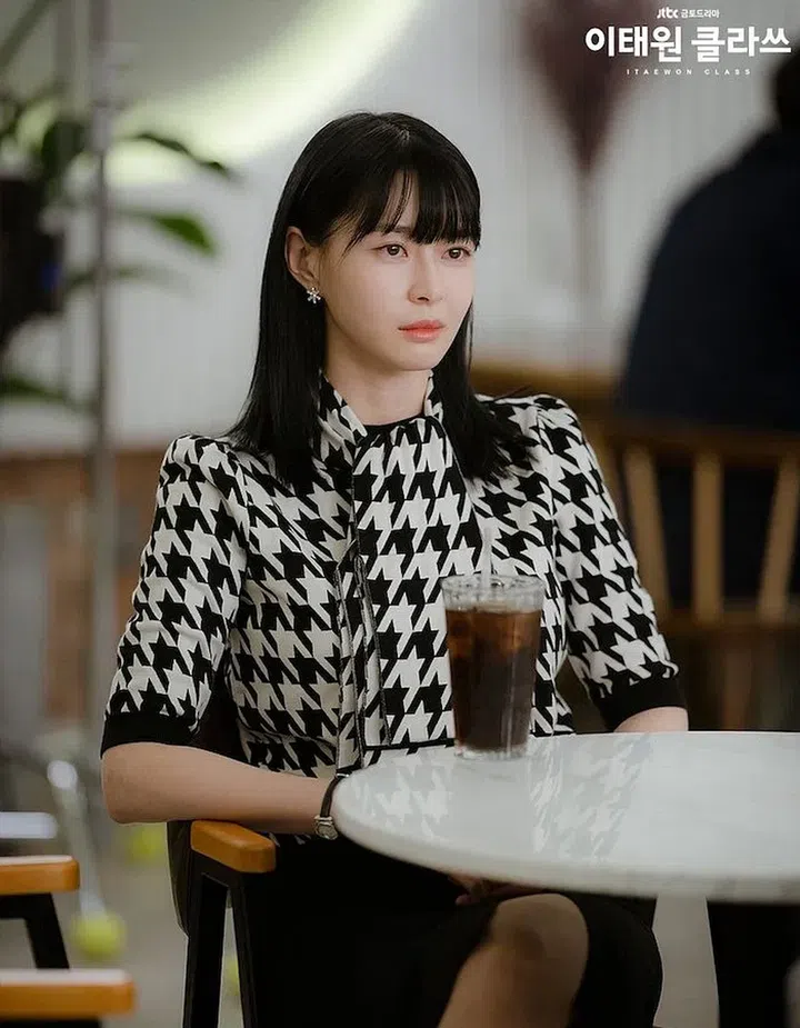 Even though Kwon Nara is only wearing white and black in this scene of Itaewon Class, she still looks polished and sophisticated. Why? It is all thanks to the statement houndstooth top she sports. Thanks to the simple yet classic colour combination, the top adds style points without looking OTT and can be a consideration when you’re shopping for a statement item. Moreover, the blouse has a draped bow detail that adds to its uniqueness.