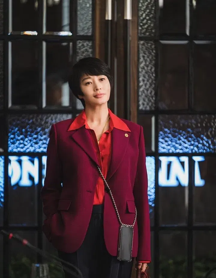 One trick about going monochrome is to play with varying tonalities. Her blazer and the shirt of both red in colour yet the former veers towards burgundy with the shirt leaning more orange-hued. Furthermore, notice how the shirt collar is placed outside of the blazer and on the lapels – a cheeky way to dress up the formulaic shirt and blazer combo according to Kim Hye-soo in Hyena.