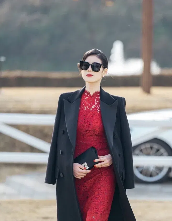 Here, red is evidently her power colour as she went with a red lace body-hugging dress. The matching lipsticks and nail polish further set the tone for her imposing characterisation. So if you’re looking to make a powerful statement on your first day back to the office, tap on Jung and don your power colour with oversized sunglasses and a purse (Roger Vivier clutch perhaps?).