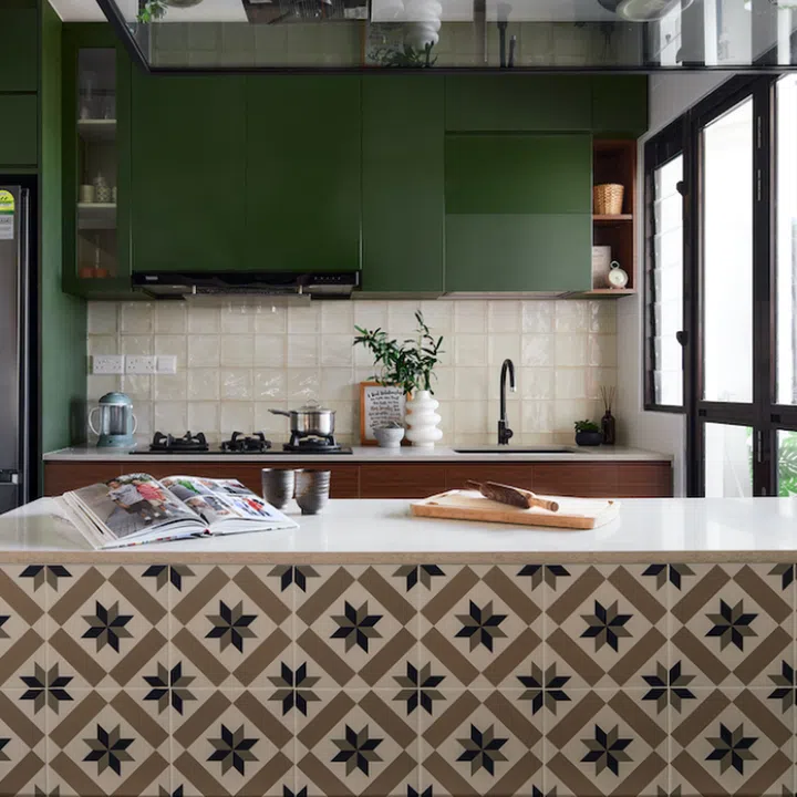 To open up the space, Rashi and Melissa incorporated an open-concept kitchen with an island. The choice of patterned tiles adds to the vintage look, complemented by the earthy wood and deep green hues.