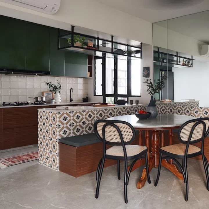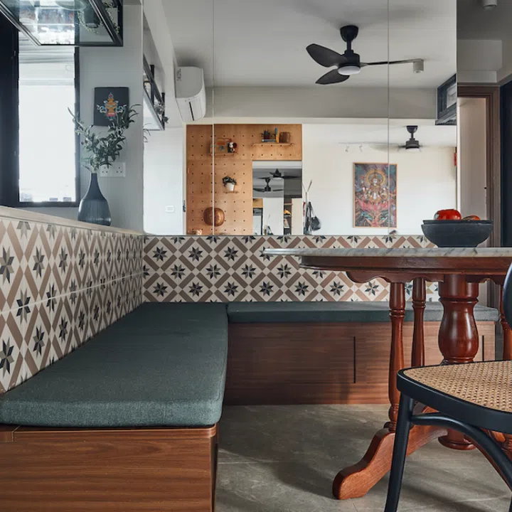 In the dining area, the Home Philosophy team custom-designed this bench to maximise storage space. A thrifted table from an old-school kopitiam adds a touch of nostalgic charm.