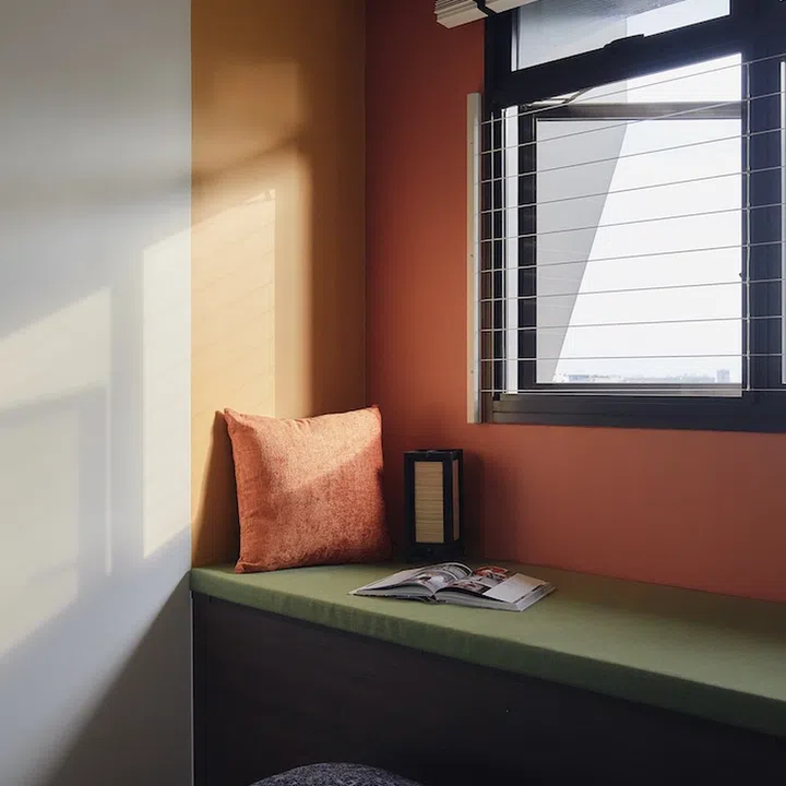 A custom-made settee bench in the master bedroom gives the homeowners room to sit and enjoy the view out of the window, while doubling as storage space. To highlight the area, Rashi and Melissa chose to colour-block the wall for contrast.