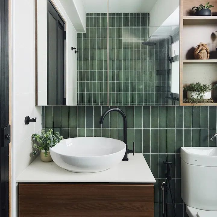 For visual continuity, deep green tiles were used in the master bathroom, creating a soothing, earthy vibe with a touch of boutique-hotel luxe.