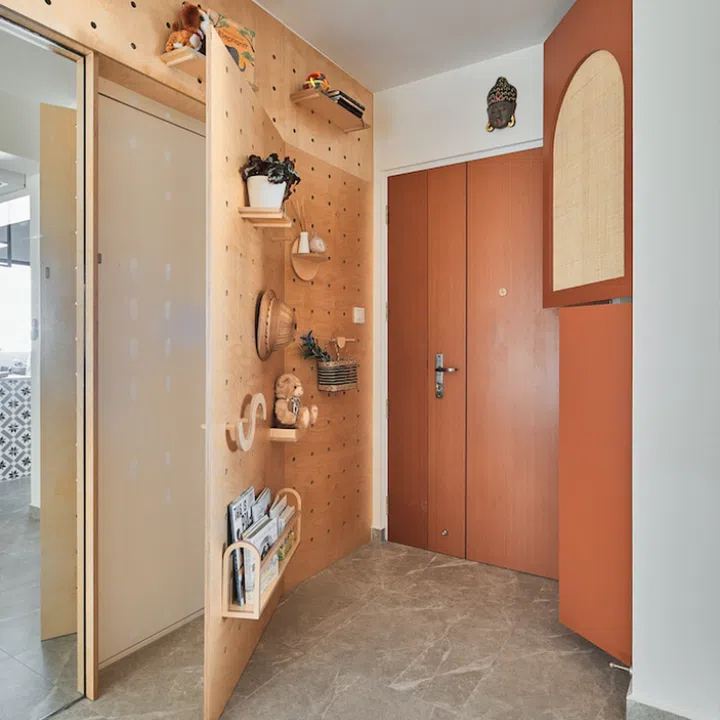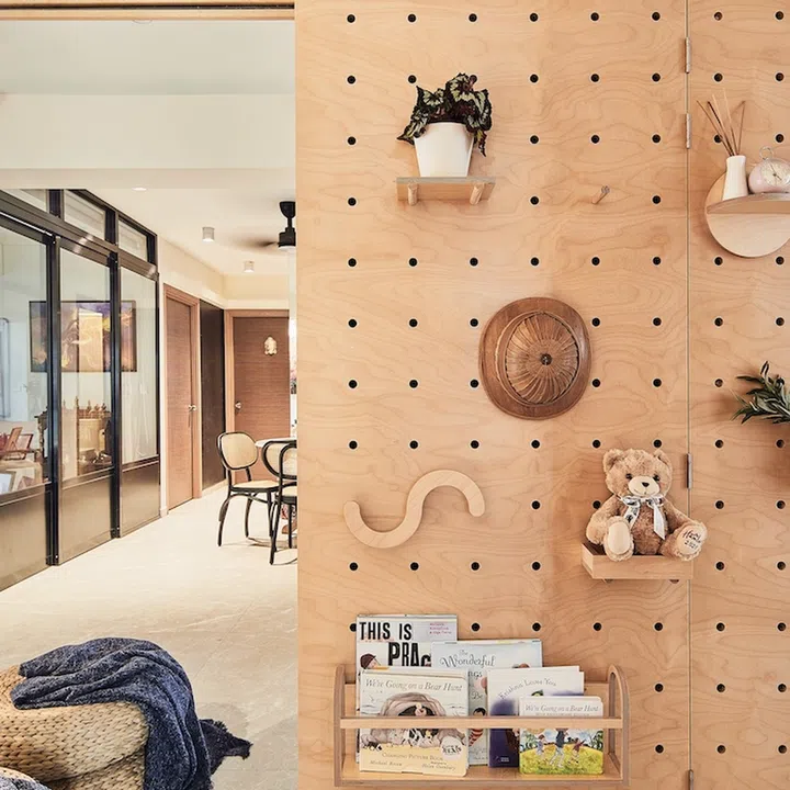 To conceal the household shelter, the team fitted a pegboard wall next to the front door. This helps the homeowners maximise vertical space by giving them a flexible place to display their book collection and the baby’s toys.