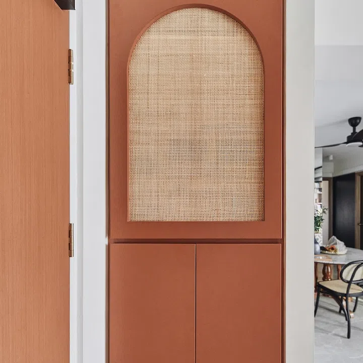 It’s the little touches that matter. To create a welcoming and aesthetically pleasing entrance feature, Rashi and Melissa swapped out the original door concealing the electrical DB box for this one, using natural handwoven rattan that was sourced from one of the last rattan weavers in Singapore. At the bottom are shelves for the homeowners to store their shoes.