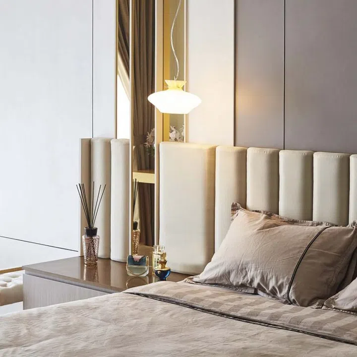 The two upper levels are the private zone. In addition to the guest room, there are also bedrooms for the couple and Mrs. Kareem’s mother, who wanted her room to have her favourite light turquoise blue, which Han incorporated into the headboard.