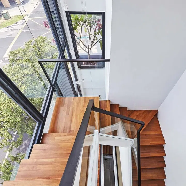 Making it brighter and airier is a four-storey glass wall on one side of the stairwell that lets in plenty of sunlight.