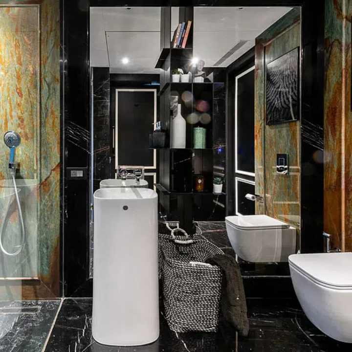 Each en-suite bathroom echoes the aesthetic of its attached bedroom.