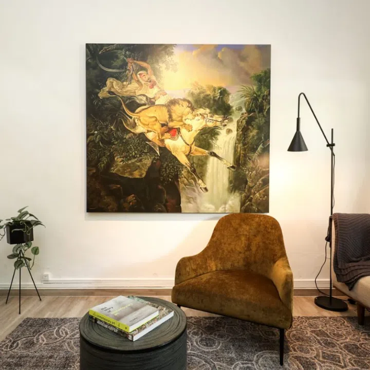 Over in the living room, there hangs a painting of a lion attacking a horse and its horseman, a piece by Indonesian graphic artist Uji Handoko.