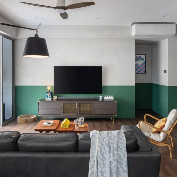 Apart from maximising the space, they also wanted a monochrome style, which Yang achieved with dark-green half-walls throughout the house. These are accented with flooring and furnishings in earthy neutrals, lending visual balance to the palette. The resulting look was an interesting mix of retro and industrial.