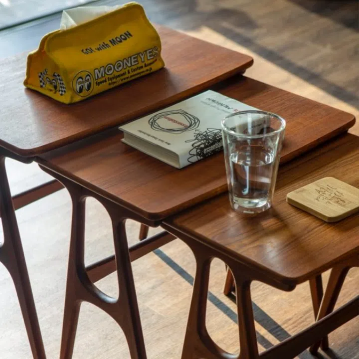 Other thoughtful design elements, like this set of nesting coffee tables, help to save space.