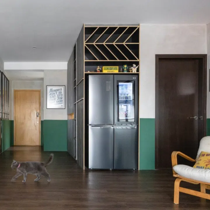 One of the considerations was the couple’s love for hosting friends and family. It made more sense, therefore, to put the refrigerator in the hall where guests could access drinks easily. Yang also added a shelf for the homeowners to store wine and liquor bottles.