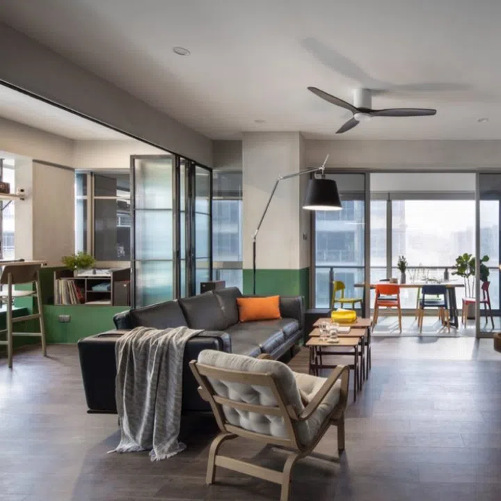A suspended desk between the bay window and ceiling provides privacy and space for the couple to work, while foldable mild steel doors allow closing off the space for air-conditioning. When not in use, the doors fold back to enhance the spaciousness of the communal area.