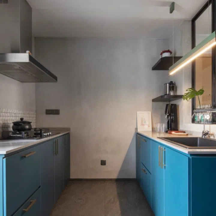 The kitchen itself is kept minimalist. Since the homeowners wanted to reduce the possibility of hoarding clutter. The bottom cabinets are outfitted with Blum systems for durability.