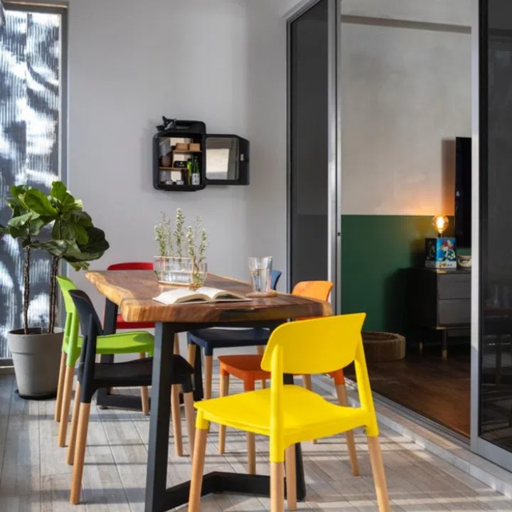 To maximise space, the dining table was moved out into the balcony, transforming it into an al-fresco dining room. On the wall is a bar cabinet by Danish Fuel, while an upcycled military jerry can on the table houses shooter glasses.