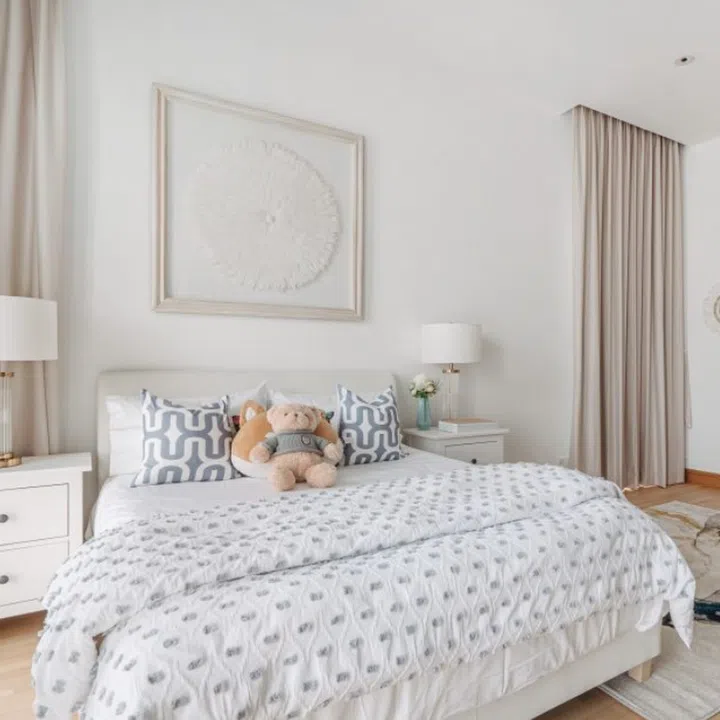 The bedrooms of the couple’s eldest and teenage daughter are designed with a similar white and neutral base. The teenage daughter requested an all-white room. The colour palette is mainly white, beige and a pop of blue. A white vanity adds a touch of personality to the room. A circular art decor piece is used to pair with the round mirror of the vanity.