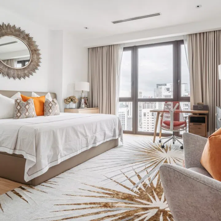 The eldest daughter’s room was transformed into a boutique hotel bedroom. The design is bolder yet still restful. Zones for work and rest were created to suit her needs.