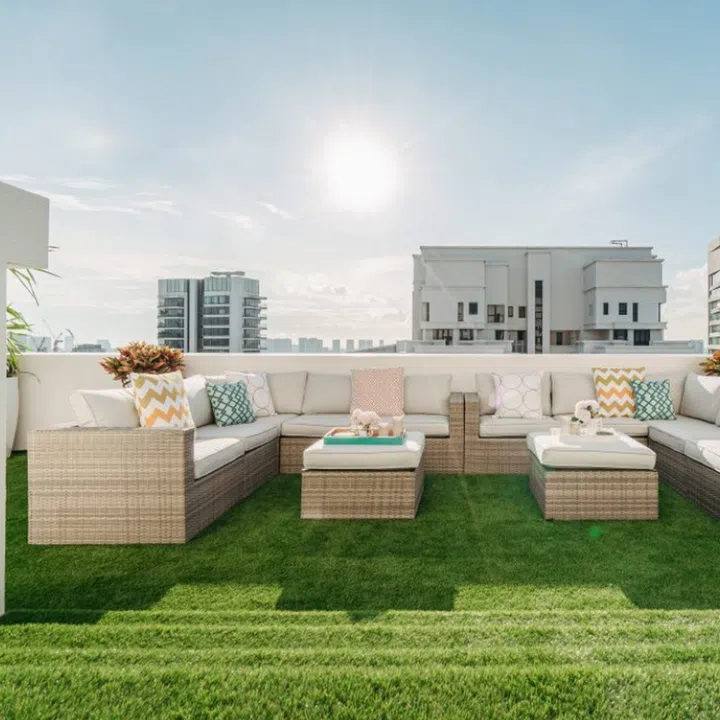 The outdoor spaces of this home are grounded in greenery, including artificial turf, potted plants, or even urban vegetable beds. Different entertaining areas such as private dining nooks, intimate armchair seating, and large lounging spaces fit the family’s various needs.