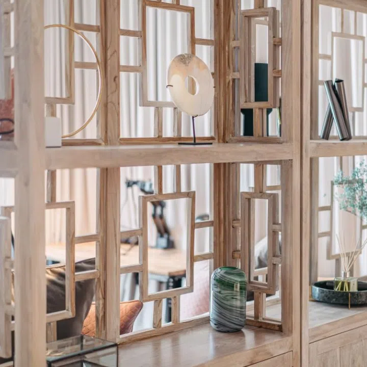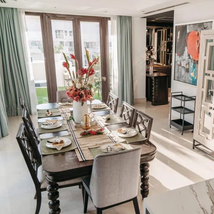 In the dining room, natural tones and textures were chosen for the dining table and crockery shelf to tie in with the wooden panes of the balcony doors and windows. Mirrors, marble and porcelain finish tie in the luxe look.