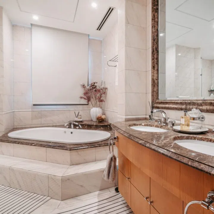 The luxurious hotel-inspired bathroom features dark marble and silver accents. The bathtub gives the couple a space to unwind and relax.