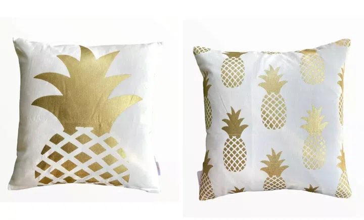 A speedy way to change things up in your space? New cushion covers. Ring in good fortune with these ones decked in a gold foil pineapple print.