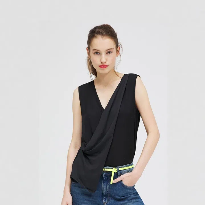 This sleek satin blouse has a V-neck, and the front panel slightly drapes on itself, adding a bit of flair. It’s sleeveless, which makes it great for warmer days under jackets.