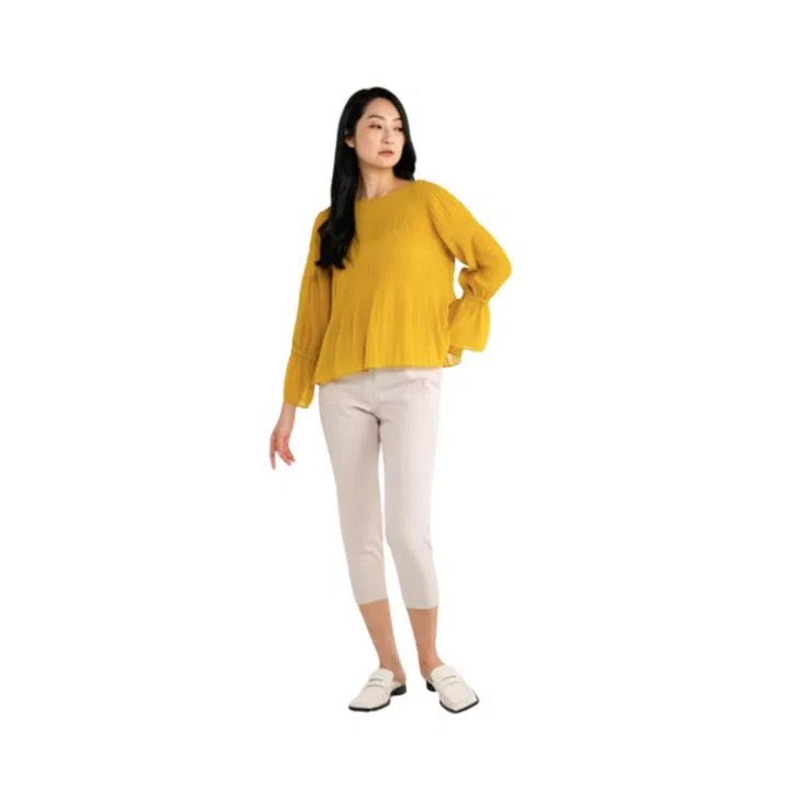 This woven shirt is a loose-fit top that comes in a summery yellow tone. The slightly flared sleeves and base of the top are just minor details that add so much to your outfit and won’t go unnoticed.