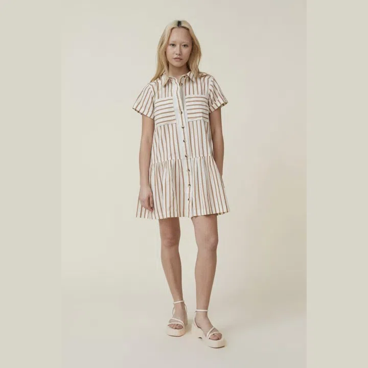 This Scout Mini Skirt Dress is available in two designs: all black or striped. It suits less conservative workspaces, such as start-ups and tech companies. The button-up design paired with the boxy shoulders and collar, bring a formal touch to an otherwise informal look.