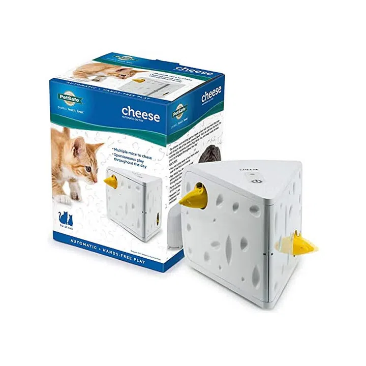 Keep your feline companion entertained for hours with this interactive cheese block! Cats and kittens can keep active as they play peek-a-boo with two mice that dart from either side of the block of cheese. The Cheese cat toy can be set to activate three separate automatic play sessions throughout the day, and turns off automatically after 15 minutes or manually with on/off button.