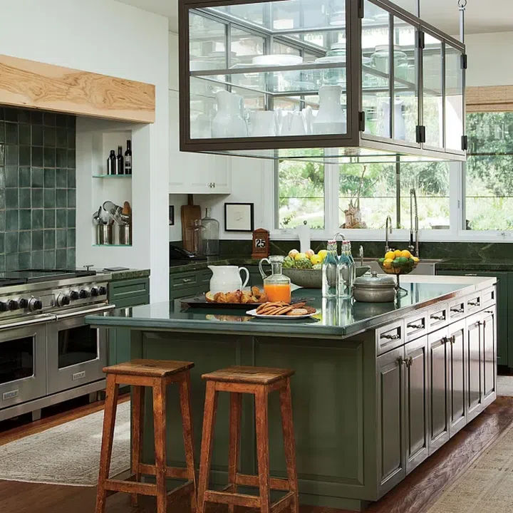 In Ellen DeGeneres’s Beverly Hills kitchen, the range is by Wolf, and the hidden sotrage space at the side is perfect for kitchen utensils and cookware to be within arm’s reach. The deep green tiles that line the range area matches the paint of the centrepiece table. A custom-made glass display case for storing tableware hangs above.