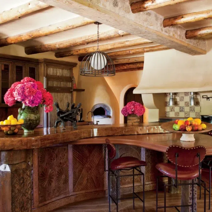The Nuristani oak panels used for the kitchen cabinetry in this naturalistic home is designed by Architect Stephen Samuelson. Wooden beams overhead and dark chairs accent the space.
