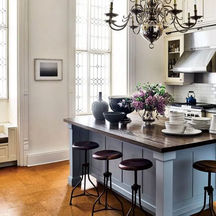 Award-winning actress Jessica Chastain’s Hamptons-style kitchen features a luxe chandelier from Ralph Lauren Home. Her contemporary kitchen pairs traditional wainscoting details on the kitchen cabinetry with the dark finishes of a modern home.