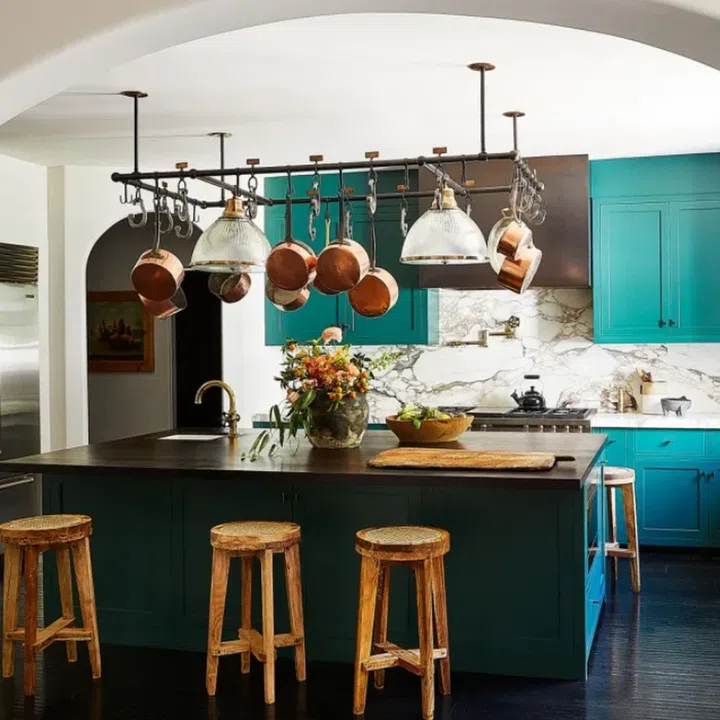 In the kitchen, the cabinets are painted in teal. Antique fixtures such as the bronzed waterworks fixtures and Pierre Jeanneret teak stools complete this kitchen’s look.