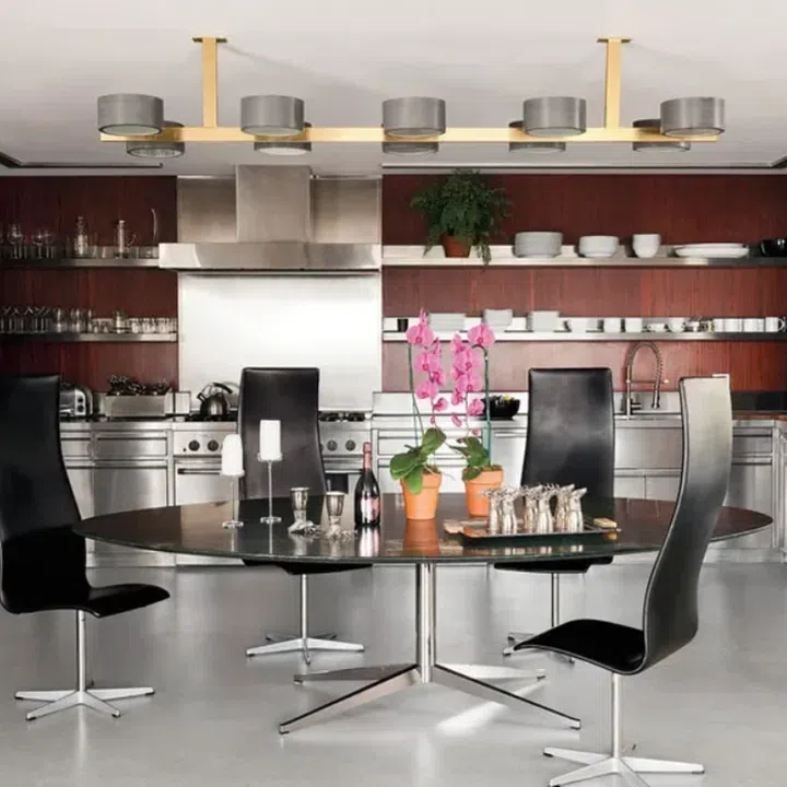 A stainless-steel kitchen with a table by Florence Knoll and a set of Arne Jacobsen chairs makes this space ready for guests. The vintage light fixture is by Stilnovo.