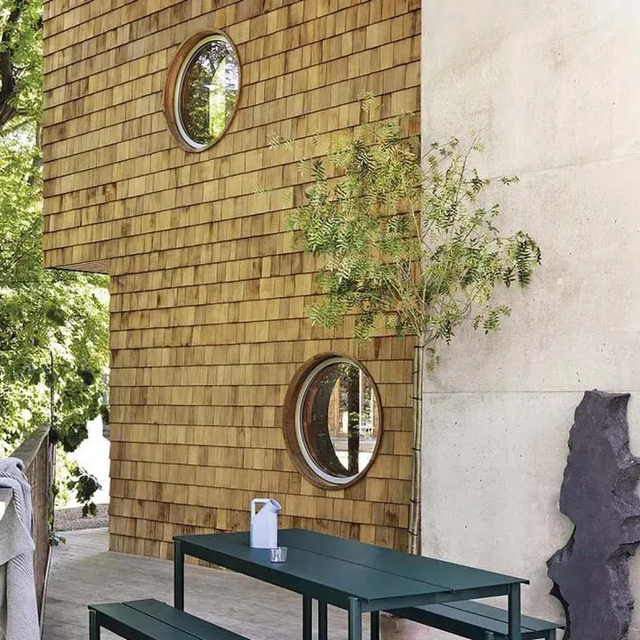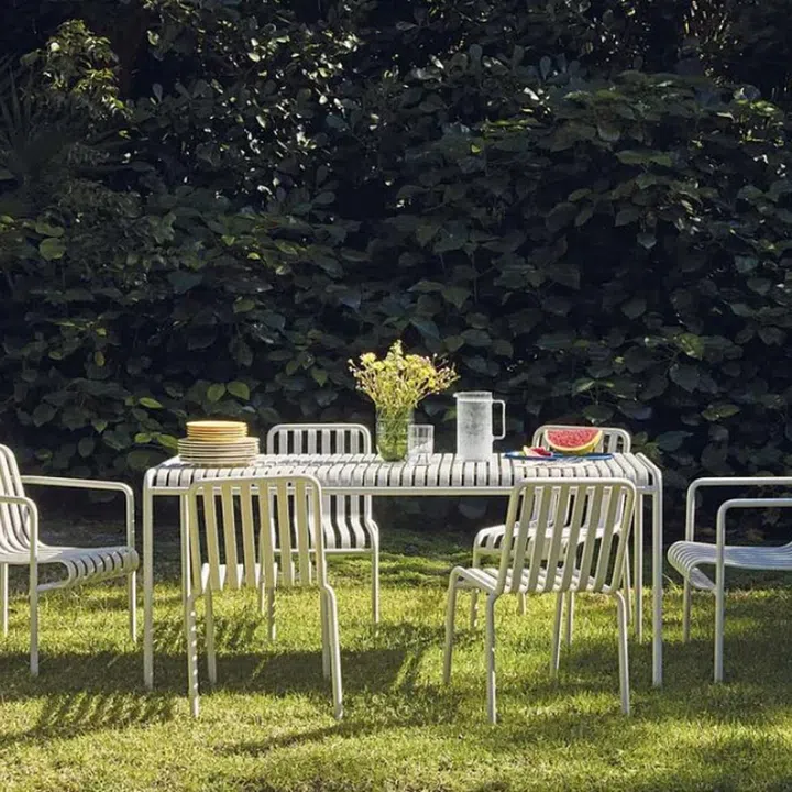 Inspired by the principle of symmetrical geometry, the HAY Palissade series was designed by French brothers Ronan and Erwan Bouroullec with a simple but visually strong aesthetic. The chairs and benches come in powder-coated steel, but are also available in a hot-dip galvanised finish for more durability.