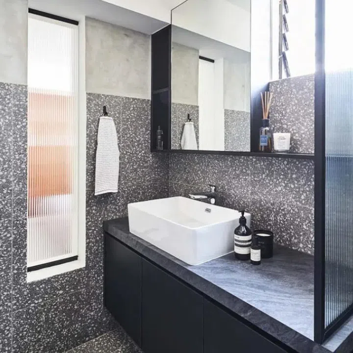 Even the “wall” between the kitchen and bedroom isn’t a wall at all, but a full-height cabinet that provides storage on both sides thanks to the generous 1m depth. There’s enough room for kitchen storage on one side, and drawers for personal effects on the other. Rei also created a fluted glass partition, so that the couple can stay connected even when one person is resting in the bedroom and the other is making coffee in the kitchen. It also has the effect of letting more light through and visually expanding the space.